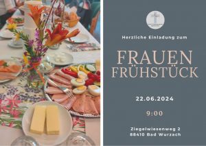 Frauenfrühstück FCG Bad Wurzach Datum:22. Juni 2024Uhrzeit:9:00 - 12:00Ort:FCG Bad WurzachAdresse:Ziegelwiesenweg 2, 88410 Bad Wurzach E-Mail: Info@FCGBadWurzach.de Internet: www.FCGBadWurzach.de