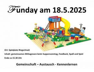 Funday Mai 2025 Datum:18. Mai 2025Uhrzeit:12:30 - 15:30Ort:Spielplatz Ringschnait Funday – Ein Angebot des Kindergottesdienst-Teams: für Familien, Eltern, Kinder. Keine Anmeldung erforderlich. Start: nach dem Suppensonntag.