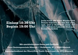 „Wunden zu Wundern“ – Jugendgottesdienst Datum:28. Januar 2023Uhrzeit:19:00 - 22:00Ort:Freie ChristengemeindeAdresse:Waldseer Straße 97, 88400 Biberach Die EFG Biberach und die Ninety-Nine Youth Church der FCG laden Jugendliche und junge Erwachsene ganz herzlich zum gemeinsamen Gottesdienst ein!